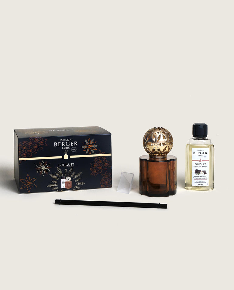 Elevate your home with the Pomelis Chocolate Brown scented reed diffuser — a refined creation that comes with warm and sophisticated Vanilla Magnificence. An ornate topper makes this reed diffuser especially special for the holidays.