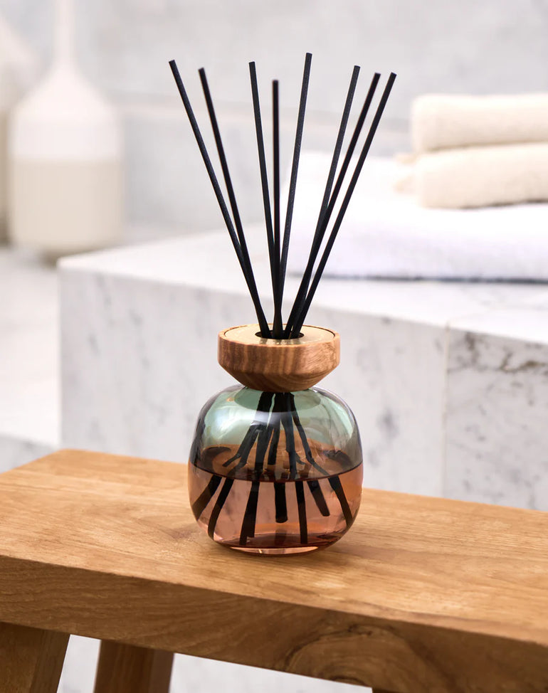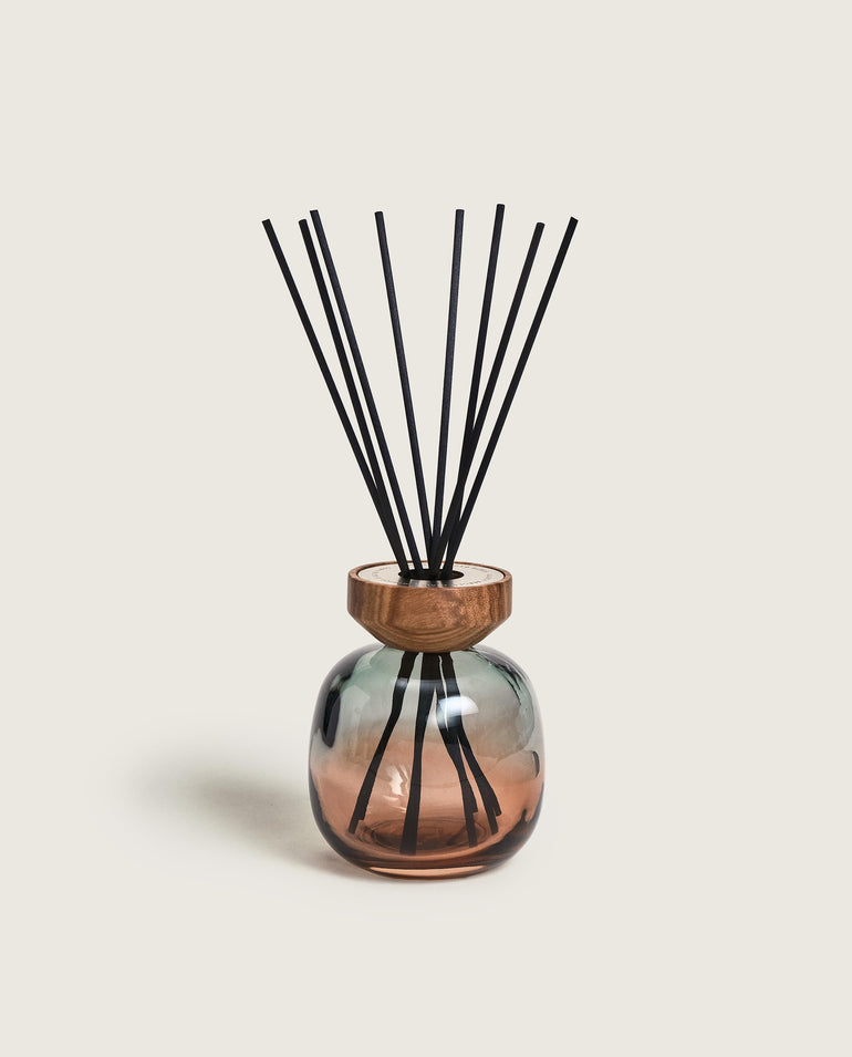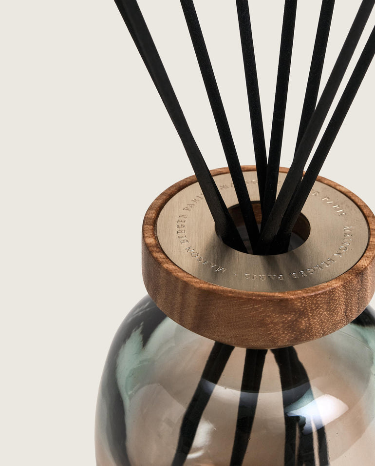 Refined and gift-worthy, this green-to-plum ombré reed diffuser celebrates raw materials with its natural wood ring, while diffusing Maison Berger's Zest of Verbena home fragrance for delightful fraîcheur.